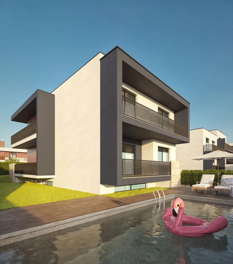 As construções, de harmoniosas linhas contemporâneas, evidenciam o rigor e qualidade construtiva com os seus materiais de excelência. Os espaços exteriores incitam à fruição da natureza e do sol, e a tardes intermináveis de lazer.